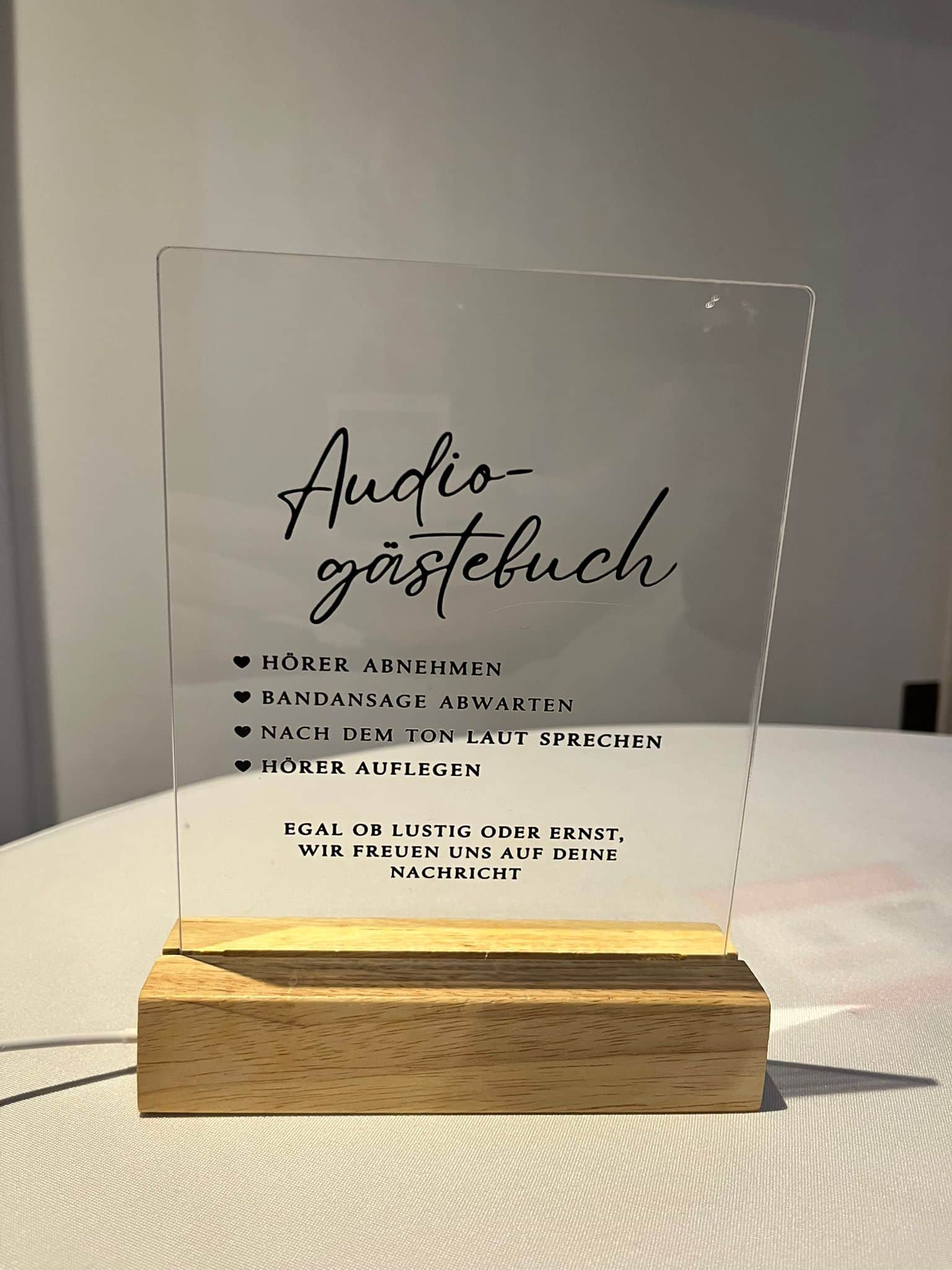 Das Audio-Gästebuch ist eine besondere und persönliche Alternative zum klassischen Gästebuch. Statt geschriebener Worte hinterlassen deine Gäste emotionale Sprachnachrichten, Glückwünsche und Erinnerungen, die auch Jahre später noch berühren. Die einfache und intuitive Bedienung macht es für Gäste jeden Alters zugänglich, während die hochwertige Aufzeichnung eine ausgezeichnete Tonqualität sicherstellt. Ob Hochzeit, Geburtstag oder Firmenfeier – dieses Audio-Gästebuch hält die schönsten Momente authentisch und lebendig