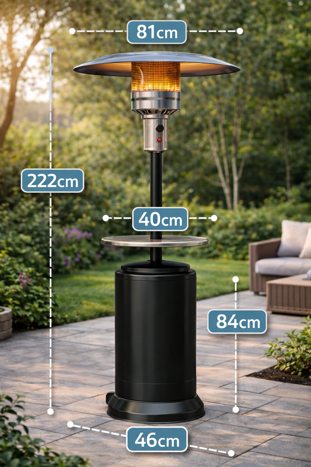 Der Gasheizstrahler mit einer Höhe von 2,2 m und einer Leistung von 12 kW ist die perfekte Lösung für gemütliche Wärme bei jeder Veranstaltung! Mit seiner starken Heizleistung sorgt er zuverlässig für angenehme Temperaturen – ideal für Terrasse, Garten oder Eventfläche. Der integrierte kleine Tisch bietet praktischen Platz für Gläser oder Snacks und macht den Heizstrahler besonders komfortabel im Einsatz. Dank robuster Bauweise und einfacher Handhabung eignet er sich perfekt für private Feiern, Gastronomie oder Firmenevents – für wohlige Wärme und entspannte Atmosphäre bei jedem Anlass!
